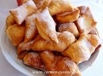 Abaisser la pâte au rouleau sur 3 mm d' épaisseur. Débiter la pâte en bandes, et couper selon la taille que vous désirez (environ 5 à 7 cm). Faire une incision au centre puis passer un coin dans l'incision et faire comme un nœud. .