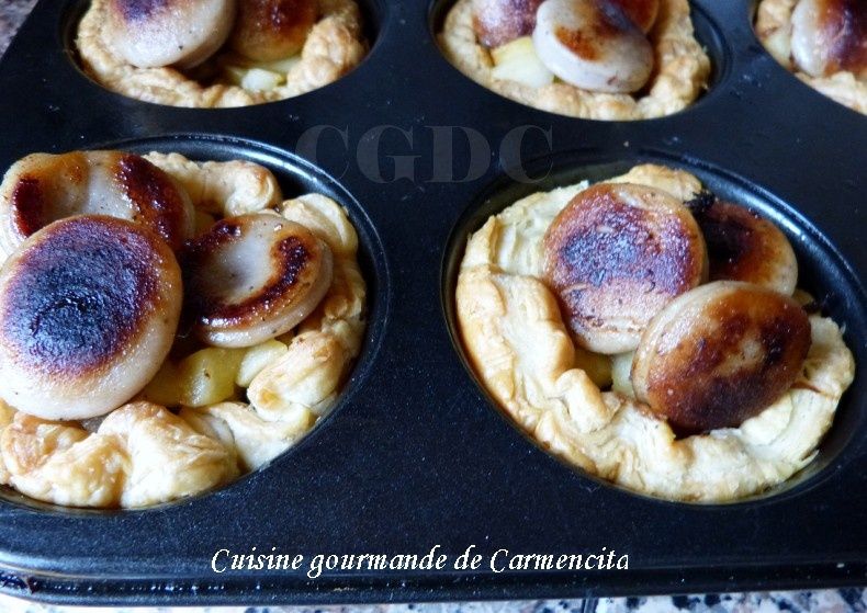 Garnir chaque feuilleté d’oignons confits, pommes et boudin blanc.